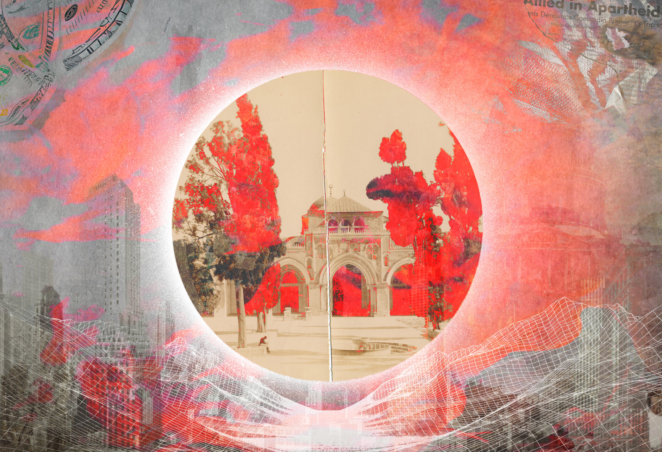 “community is resistance” is a digital collage that juxtaposes a historic Palestinian photograph of The Aqsa Mosque in Jerusalem, sourced from the New York Public Library Digital Collections archives—with intrusive capitalist symbols of the Western world fading in the background. The image explores rogue archives as a visual act of resistance that recontextualizes imagery to reclaim Palestinian memory from institutional and colonial erasure. This work confronts the colonial impulse to sanitize and flatten lived experiences, especially of dispossessed peoples. By disrupting visual hierarchies, the piece asserts that memory is not neutral. In the wake of ongoing settler-colonial and genocidal violence, this artwork insists on preserving what dominant archives attempt to delete: survival and collective resistance. “community is resistance” becomes a counter-archive, housed in community, protest, and visual reappropriation.